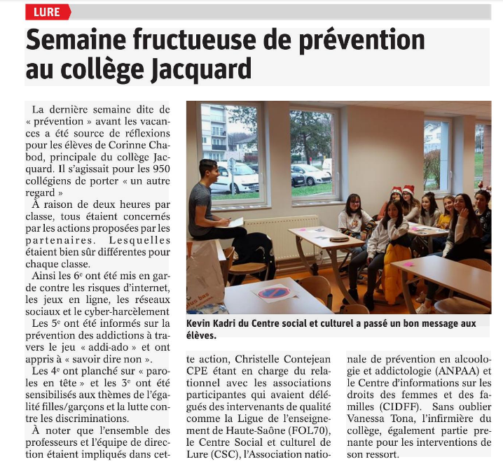 Dans le cadre du Comité d’Éducation à la Santé et à la Citoyenneté (CESC), tous les élèves du collège ont bénéficié d’une action de prévention au cours de la semaine avant les vacances de Noël. Ces actions ont été mises en place grâce à la participation de différents partenaires : la Ligue de l’enseignement de Haute Saône (FOL70), le Centre Social et Culturel de Lure (CSC), l’association nationale de prévention en alcoologie et addictologie (ANPAA) et le Centre d’informations sur les droits des femmes et des familles (CIDFF).
