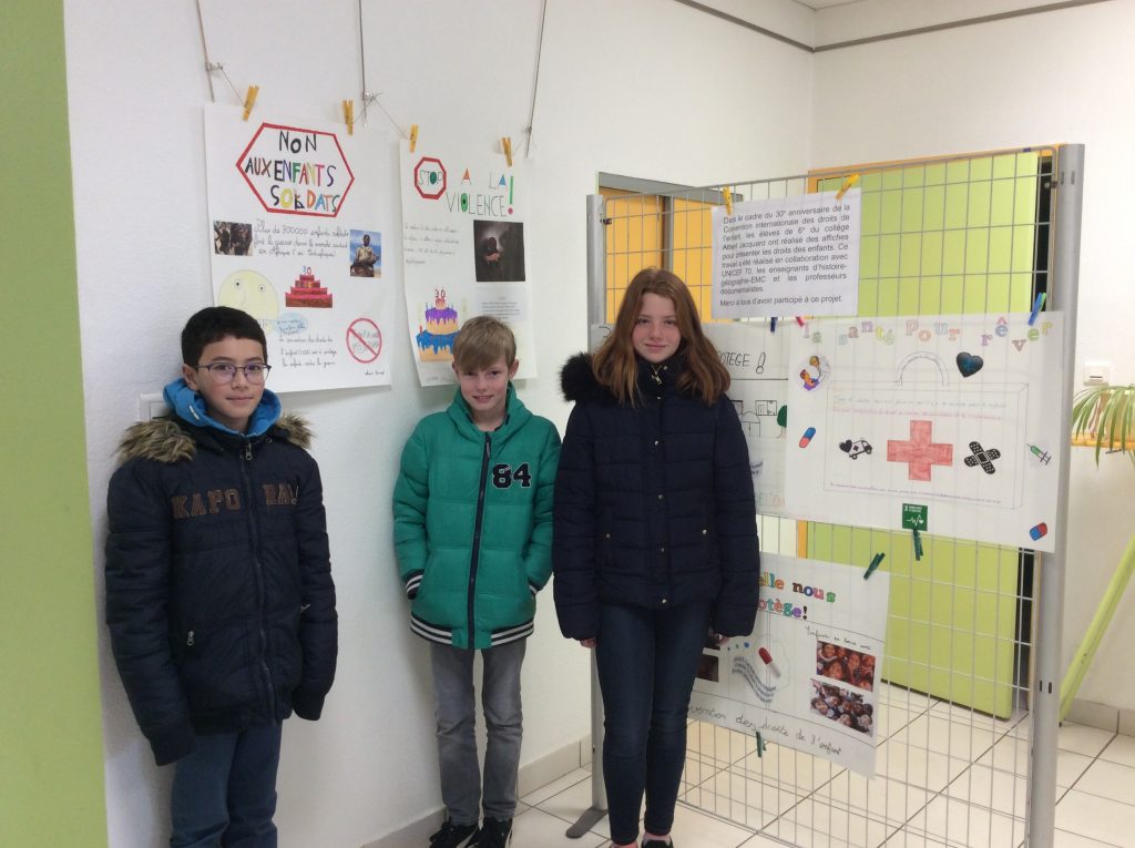 Les élèves de 6e ont célébré le 20 novembre dernier les 30 ans de la CIDE (Convention internationale des droits de l’enfant). Ils ont réalisé une quarantaine d’affiches pour présenter les principaux droits des enfants. Quelques unes sont affichées dans les vitrines des magasins du centre-ville de Lure et les autres sont exposées au Centre social et culturel. Les élèves ont fait ces affiches en groupe au CDI durant les cours d’EMC (enseignement moral et civique).